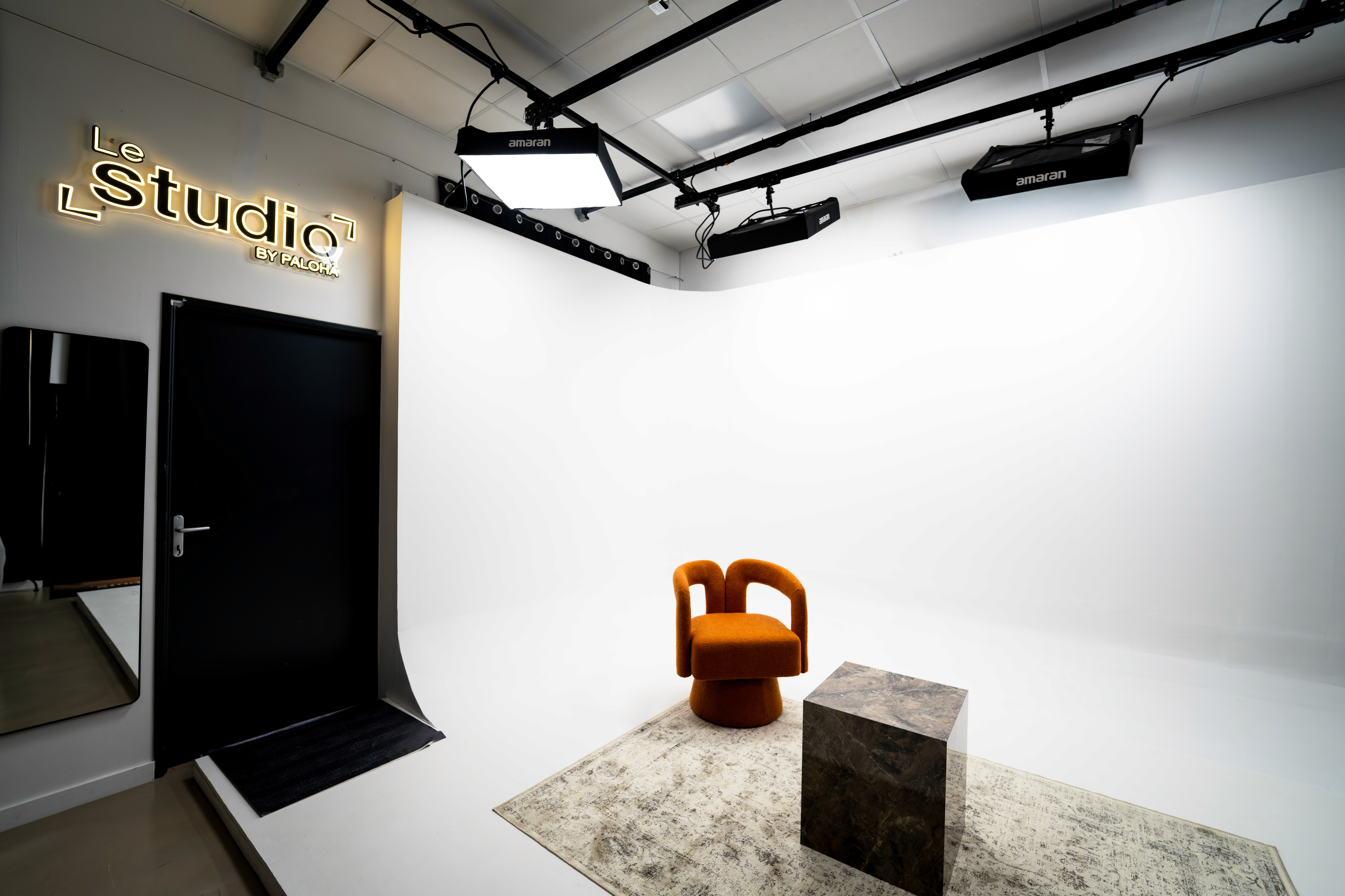 Le cyclorama est éclairé de manière uniforme pour un rendu propre, en photo comme en vidéo. Le studio est aussi équipé d’un contrôleur DMX avec pilotage via tablette, et d’une machine à fumée pour enrichir vos ambiances. Tout est prêt à être utilisé dès votre arrivée, pour créer sans contrainte technique.