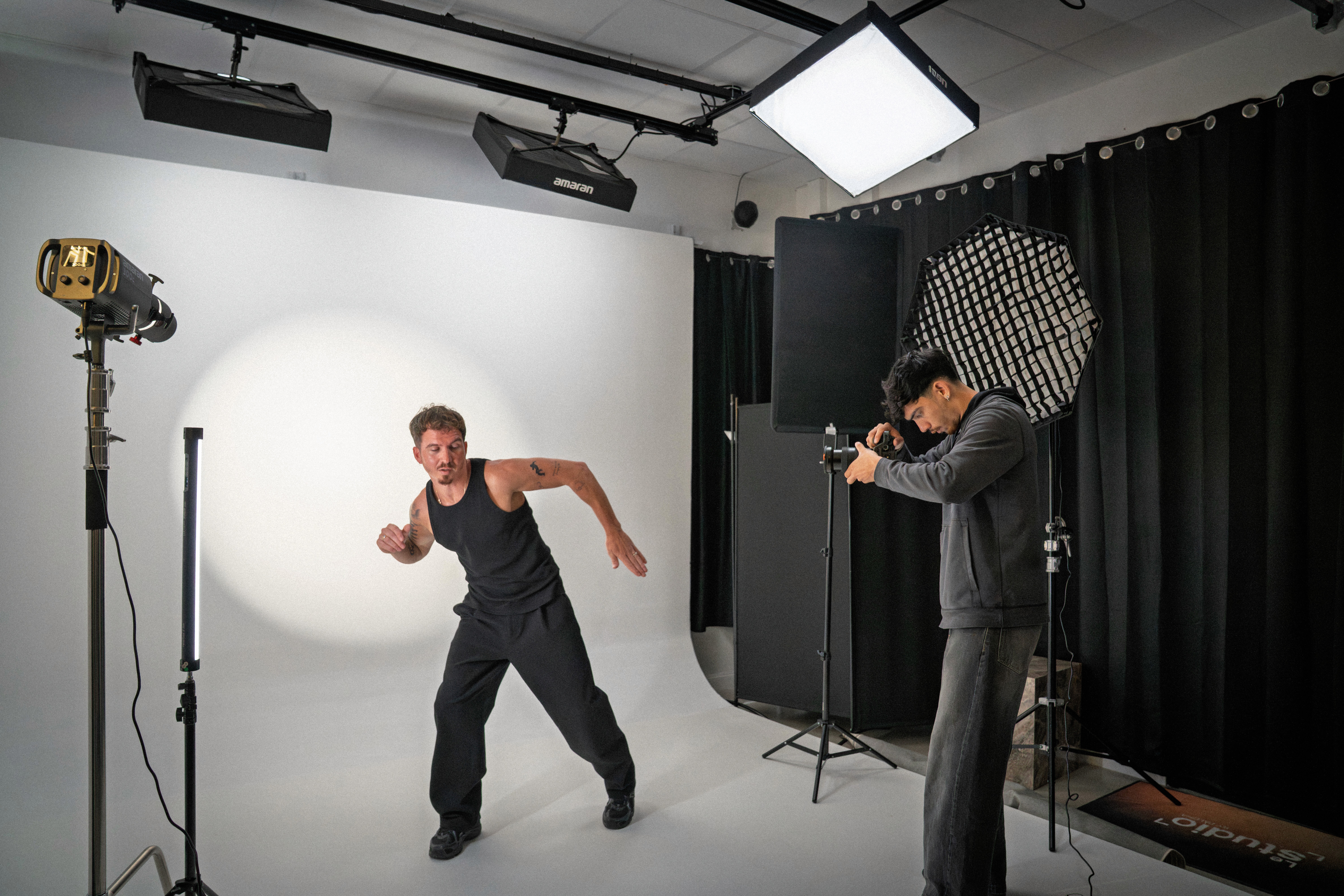 Au Studio, vous avez accès à un équipement complet, déjà installé : éclairages continus (Aputure 300x, Amaran 300c), flashs studio (Godox AD600 Pro II), ainsi que tous les supports nécessaires (C-Stand, softbox, modificateurs).